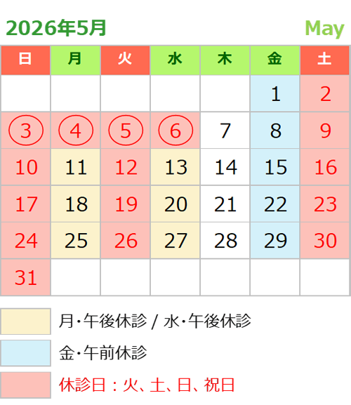 休診日:月曜午後、火曜、水曜午後、金曜午前、土、日、祝日